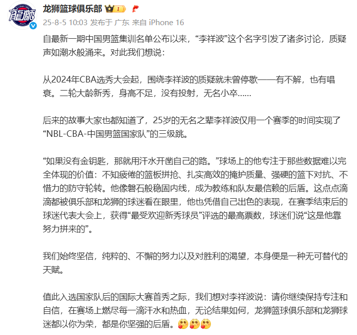 “自最新一期中国男篮集训名单公布以来,‘李祥波’这个名字引发了诸多讨论,质疑声如潮水般涌来。对此我们想说:从2024年CBA选秀大会起,围绕李祥波的质疑就未曾停歇——有不解,也有唱衰。二轮大龄新秀,身高不足,没有投射,无名小卒……