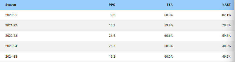 从2020-21赛季至今,贝恩每个赛季的得分效率(真实命中率)保持惊人的稳定性(始终维持在58.9%至60.6%之间),而他受助攻得分的比例出现了大幅下降。